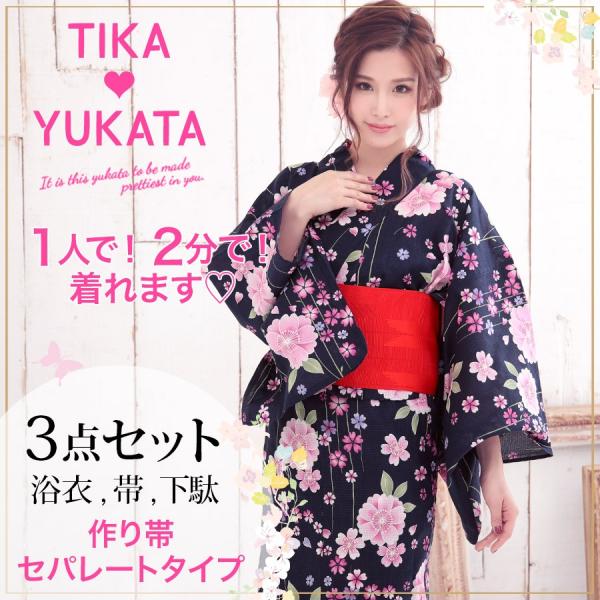 浴衣 セット かわいい浴衣 Tika ティカ しだれ桜 浴衣3点セット セパレート浴衣 作り帯 下駄 紺地 ピンク 赤帯 女性用浴衣 レディース浴衣 Buyee Servis Zakupok Tretim Licom Buyee Pokupajte Iz Yaponii